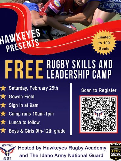 Hawkeyes Rugby Academy, in partnership with the Idaho National Guard, are proud to present a FREE rugby skills and leadership camp. This camp will be held at Gowen Field with check in beginning at 9am. Apart from working on your rugby skills with the Hawkeyes Coaches, you'll get to tackle a military style obstacle coarse and leadership training with the Idaho National Guard.